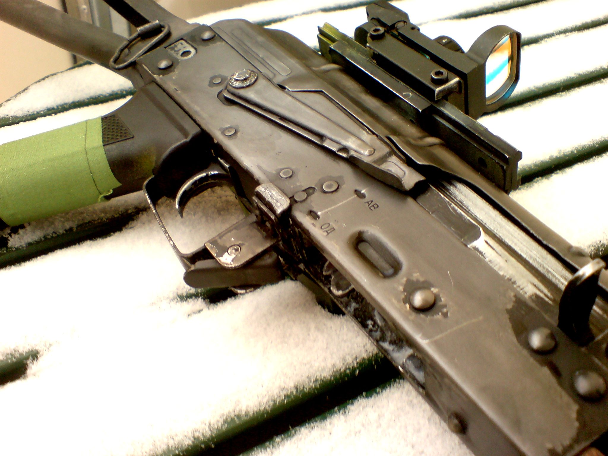 ono to asi jen tak vypadá,ale ve skutečnosti je to hodně matný.Vlastně to teď může být trochu lesklý,je to nakonzervovaný olejem.tohle bylo pro pokus.Chci pořídit ak74 od classic army,nebo časem gbb od WE,protože je celoželezný.nikde žádná slitina magnesia a nevím čeho a na něm provést kompletní brynýrování jak u ostrýho. jinak si hodně zakládám na patině u sovětských zbraní,tak proto tam je nějaká ta barva atd...