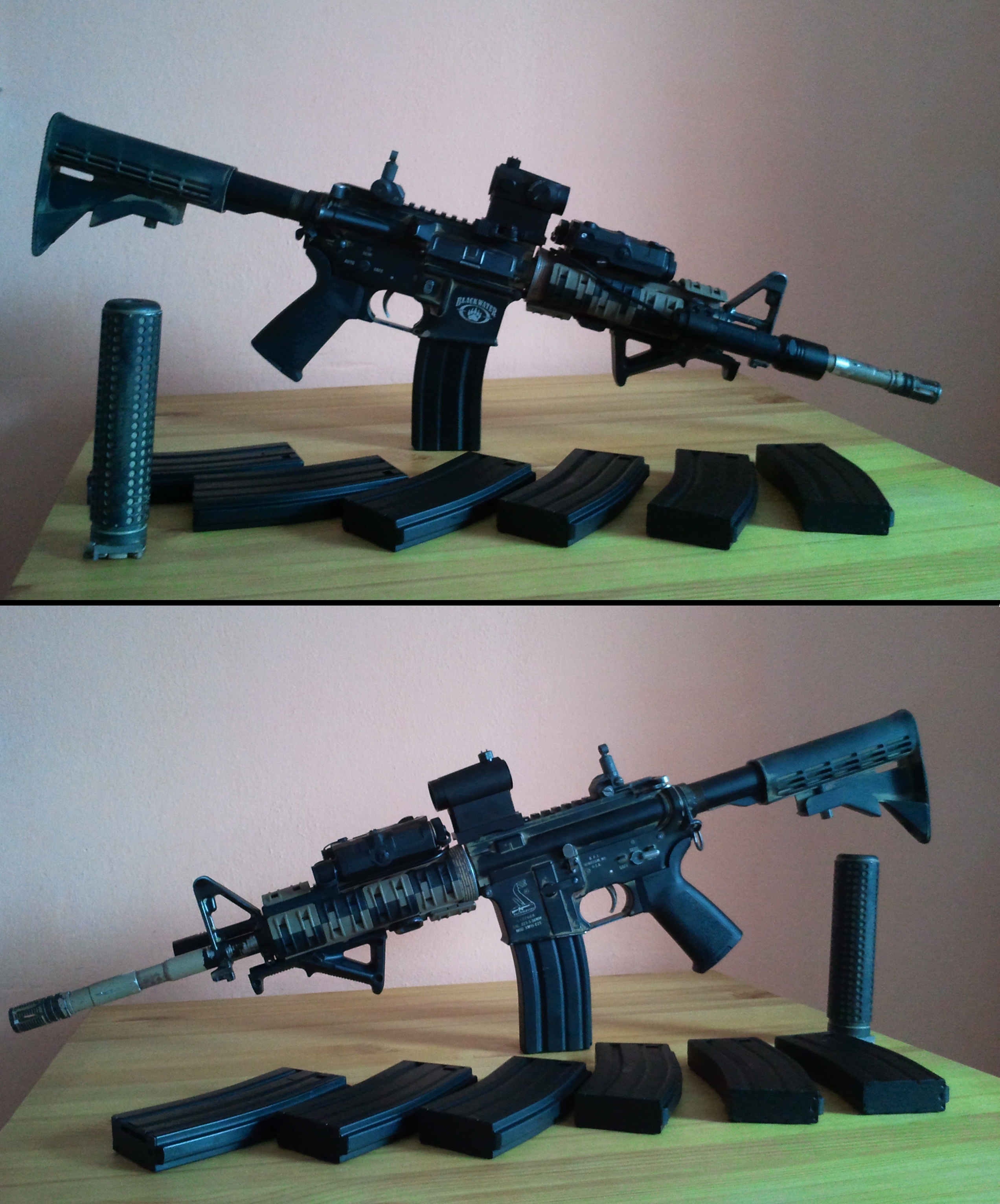 Zde po menších úpravách moje M4. Bývala celá nabarvená, teď jsem odbarvil tělo a pažbu, hlaveň úmyslně zůstala jak je: