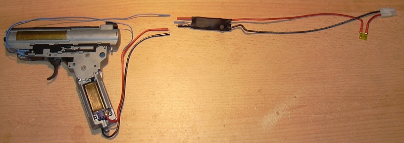 Na fotce je přidaný mosfet na původní kabeláž (místo pojistky) u zbraně m4a1 od firmy Aimtop, cena včetně rozborky a sborky zbraně.