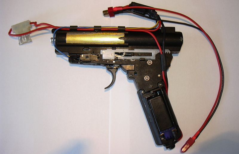 Na fotce je na zakázku vyrobená kabeláž s mosfetem (umístění vedle hop-up komory) pro zbraň AKS74 s baterií nad mechabox nebo na kovovou sklopnou pažbu, kabeláž byla montována přímo na mechabox, který zázazník poslal.