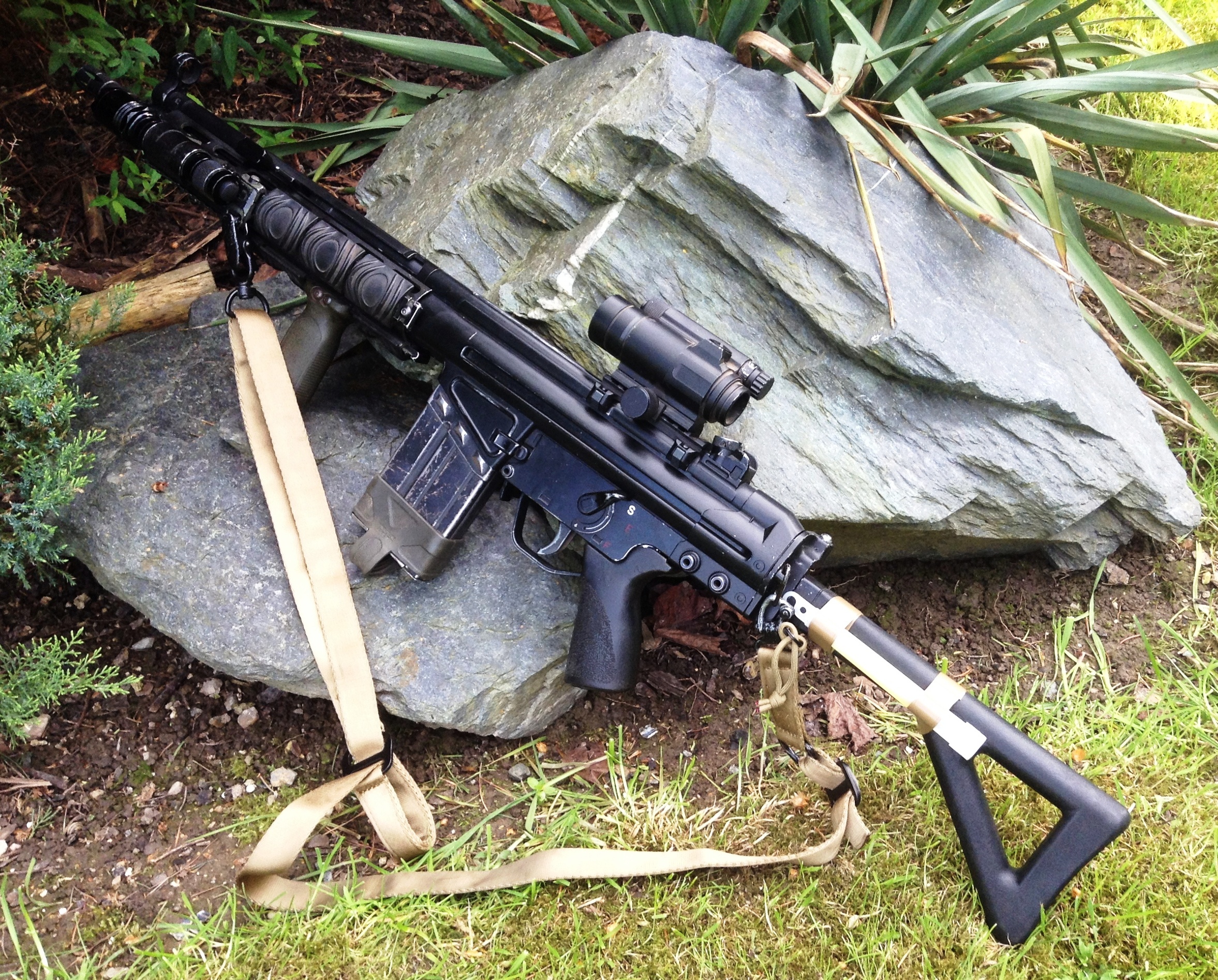 Tady posílám své DMR. Původně to je Armalite M15A4 SPR od CA. Výkon je cca 140 m/s s 0,36g BB. Tlumičem prochází hlaveň PDI 650mm/6,01mm. Mód střelby mám nastavený semi=jeden výstřel, auto=3 ranný burst. Budu měnit předpažbí za rifle Magpull MOE a doufat že tam dám Lipolku  rád bych se totiž zbavil AN/PEQ 2 a taky tam chci jinou montáž na bipod.