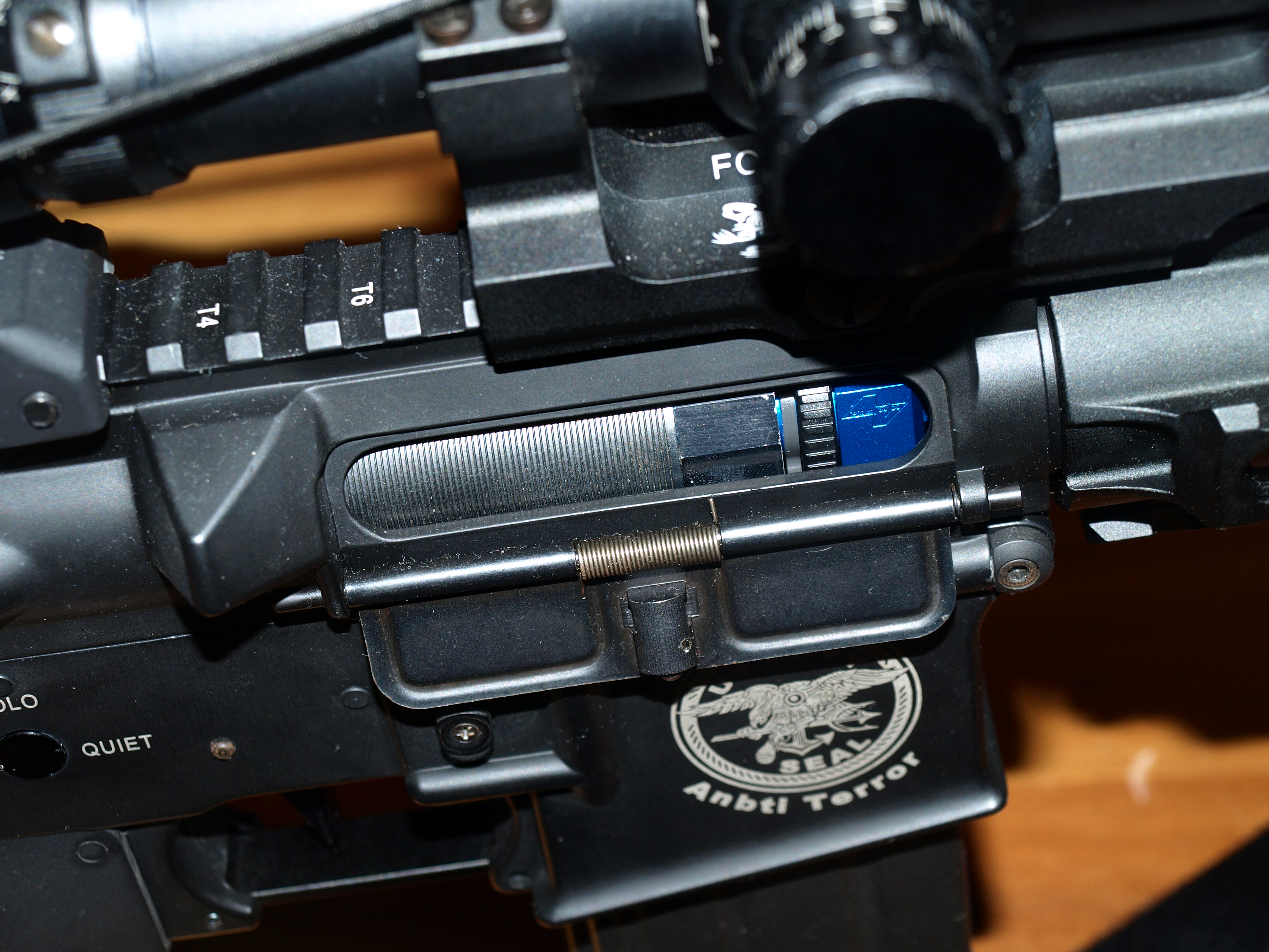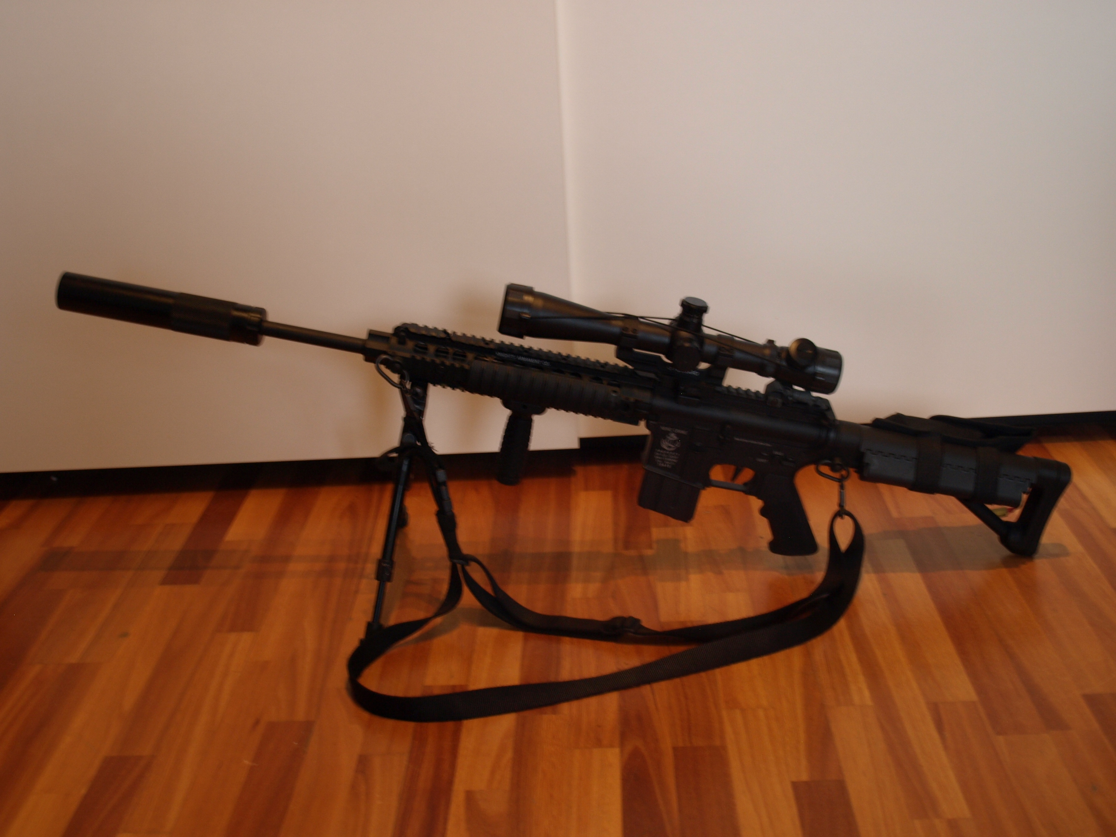 Zbraň má opravdu dlouhé předpažbí (a mnohem delší hlaveň) se čtyřmi lištami (horní je spojena s tou na těle). Se zbraní dostanete 2. krytky na lišty, rychloupínací montáž na optiku (nejlepší co jsem kdy viděl) a kopie optiky Leupold M3 s podsvícením a štelovaním bez šroubováku. Tato optika je něco neuvěřitelného zde bychom se mohly hádat (takže si všechny komentáře na tuto část vyprošuji), ale podle prodavače z Anareusu a po chvíli i mě je toto nejlepší optika na AS zbraň jaká je na trhu, protože zde bych kvalitu opravdu byl ochoten srovnat s původní verzí.