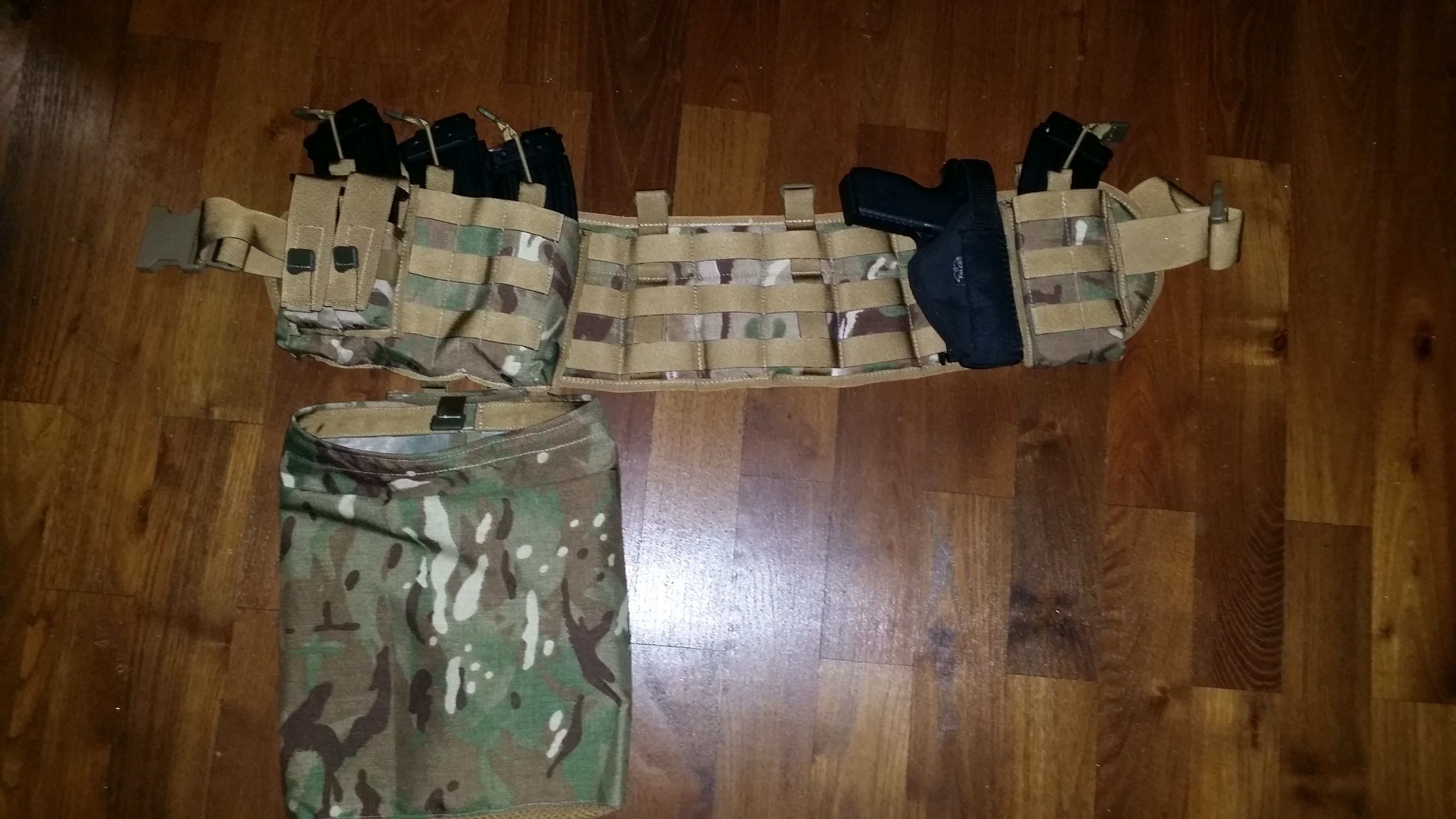 2 FLYYE INDUSTRIES? JPC Large multicam +1x acessori pouch +1x medic pouch +1x dvojite puzdro na pistolovy zasobnik +1x puzdro na flasku +1x puzdro na pistolovy zasobnik (stare) +3x puzdro na M4 zasobnik +1x odhazovak ACM