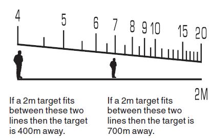 Do těch 100m si myslím že zvládneš vzdálenost odhadnout, stačí prostě střílet, střílet a střílet za různejch podmínek na různý vzdálenosti a časem se ti to dostane do krve  Takže stačí libovolná optika s obyč křížem a s rozumným přiblížením, případně by nemusel být špatný nějaký ACOG (optika fungující jako kolimátor). Jak se používá mildot (kříž s tečkama) je dost dobře vysvětlený v tom odkazu co jsem dával. Jednoduše si změříš v optice velikost pozorovanýho objektu - budeš mít třeba člověka mezi dvěma sousedníma tečkama, takže jeho "uhlová velikost" je jeden Mil, velikost člověka znáš a podle jednoduchýho vzorce si spočítáš vzdálenost - detailněji je to na těch stránkách Gunexpertu. Co se týká měření vzdálenosti pomocí stupnice jako má třeba PSO (Dragunov). Tak tam je většinou jedna rovná vodorovná čára a nad ní křivka s číslicema a když se podíváš přes tu optiku a umístíš člověka pod nějaký to číslo, tak aby byl mezi rovnou čárou a křivkou tak to číslo udává vzdálenost. Pro ilustraci je v příloze obrázek (není to z PSO, ale z jiný optiky). Závěrem bych jen řekl že, úhlový měření vzdálenosti sice AS sniper k životu vyloženě nepotřebuje, ale rozhodně to k odstřelovačině a pozorování patří a je dobrý o tom něco vědět. Jo a co se týká tý optiky z armymarketu, tak ji neznám, ale výrobce Tasco není žádná špička! Zas ale za 1000kč těžko koupíš něco lepšího a myslím si že na AS by to mělo stačit. Kdyžtak ale na ebairsoftu vyjde o pár stovek levněji.