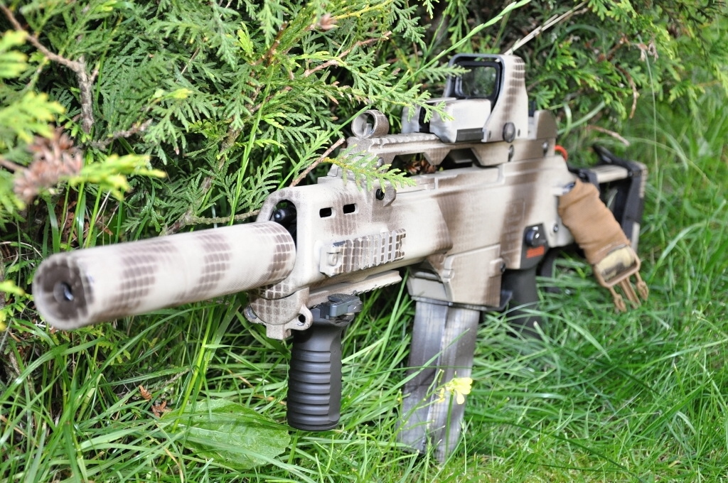 UMP double eagle zlomená pažba vyměněna za kus duralu ohlýho z vršku těla na rukojeť, tlumič (deep fire) zasunutý až do předpažbí Příloha: